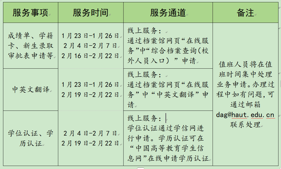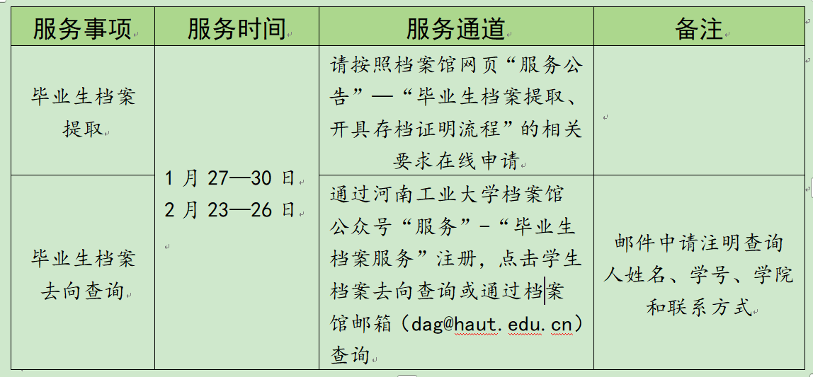 根据学校放假通知安排,档案馆寒假值班时间为1月19日—2月26日。学校内部工作查考请按档案馆值班表联系我馆,其他档案利用服务有关事宜安排如下:
